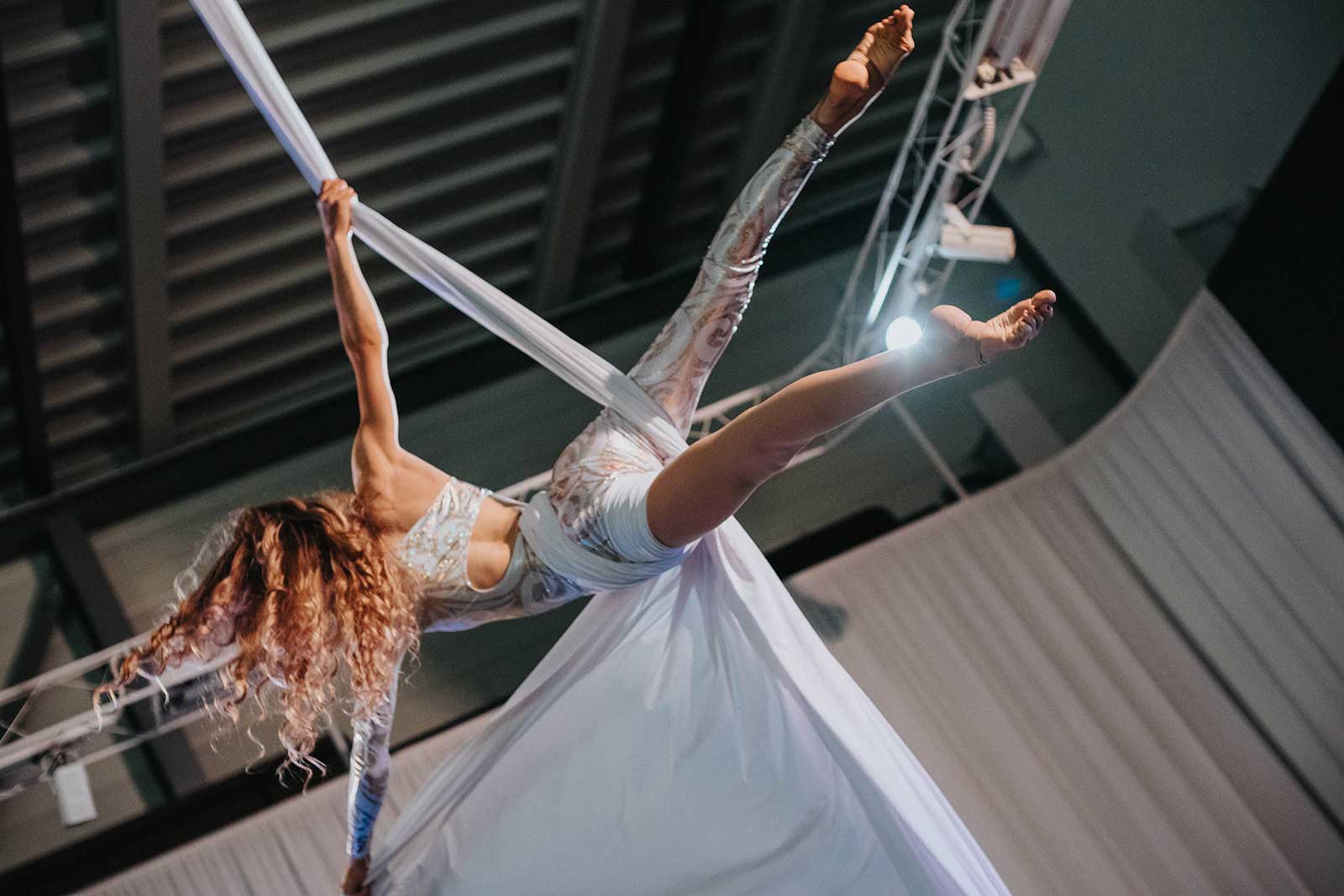 Hoch über den Köpfen der faszinierten Zuschauer präsentierte die Vertikaltuchakrobatin Alinelle ihre atemberaubende Kunst. Die elfengleiche Künstlerin überraschte mit unglaublicher Kraft und Präzision sowie mit aussergewöhnlicher Beweglichkeit und Grazie. Mit ihren akrobatischen Einlagen liess sie dem einen oder anderen Zuschauer den Atem stocken.