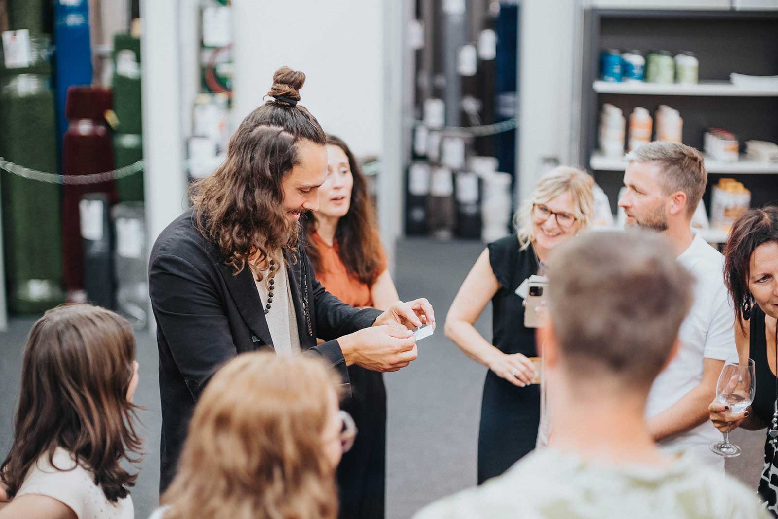 Mentalist DEKAY «The Purist», bekannt aus dem Cirque du Soleil und Zirkus Knie, zog die Gäste mit verblüffenden Darbietungen rund um unsere Wahrnehmung und unsere Gefühlswelt in den Bann. Seine mentalen Überraschungsmomente inmitten unseres Wohndesigns sorgten für Gänsehaut und fassungsloses Staunen.